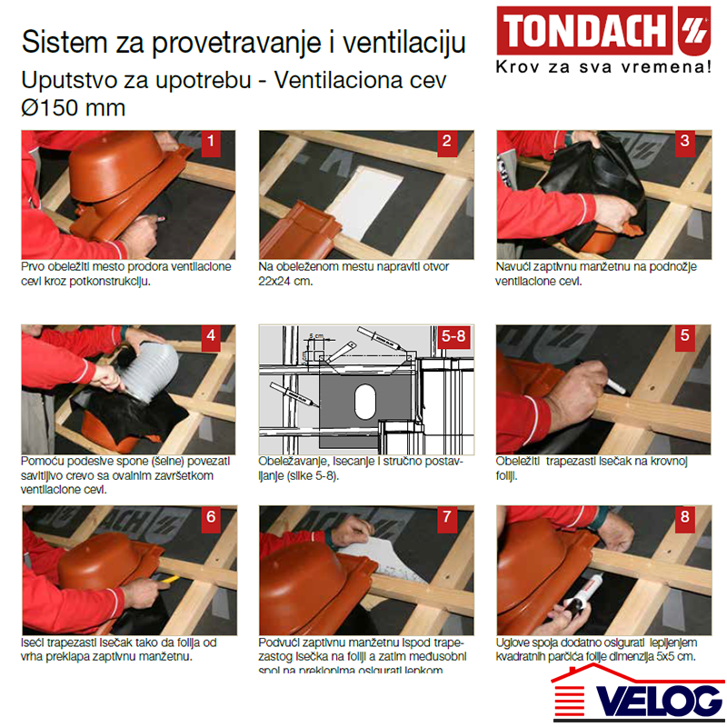 | Prednosti | • Odlično strujanje zahvaljujući veličini ventilacionih otvora (cca 176 cm2) • Ventilacioni komplet se proizvodi za sve modele presovanog crepa • Komponente sistema su idealno rešenje za postizanje standardizovanog i vetronepropusnog priključka • Jednostavna, brza i sigurna montaža • Primenjiv za sve nagibe krova • Postojan na sve vremenske uslove i UV zračenje • Prilagodljiv za prečnike ventilacionih cevi od 150, 125, 100 mm |