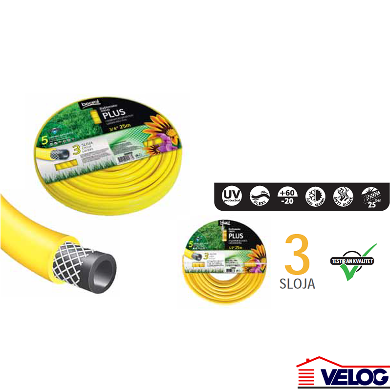 Izdržljivo fleksibilno baštensko crevo za većinu potreba u jednom domaćinstvu. Troslojno, UV otporno, sa armaturnom mrežicom od najkvalitetnijeg prediva. Unutrašnji deo creva otporan na stvaranje algi. Temperaturno otporno, sa mogućnošću korišćenja od -10° do +60°C. Pet godina garancije za korišćenje u normalnim uslovima. Primenjuje se u baštovanstvu, za navodnjavanje i odvodnjavanje.