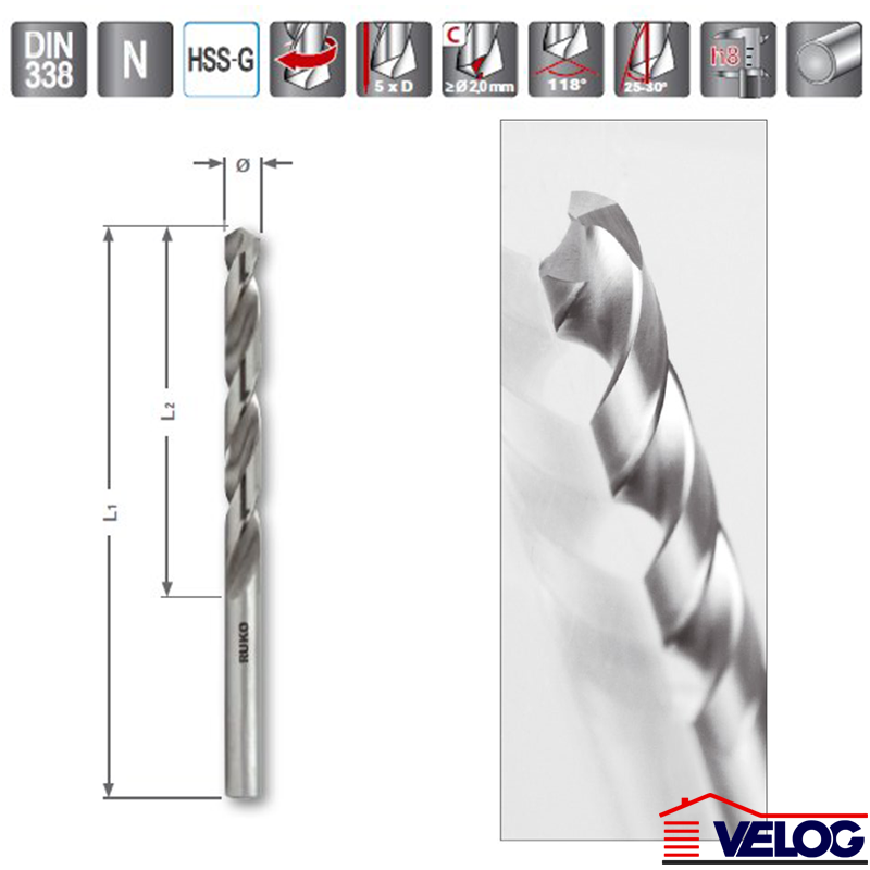 Visoko kvalitetna brušena spiralna burgija od HSS čelika. Primerna za bušenje dubokih rupa u običnim materijalima za brzo izvođenje radova. Ovu burgiju karakteriše precizan I tačan kružni hod. Veoma otporna protiv loma. Tokom bušenja ova burgija ima dobro centriranje I potrebna je tek mala snaga pritiska.