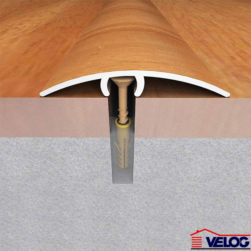 | Primena | Montaža 3379 profila sa skrivenim šrafom se vrši na sledeći način: Nakon što izbušite rupe u podu izmedju dve podne obloge, postavite u njih tiplove a u same tiplove malo silikona. Postavite šrafove u ležište sa donje strane 3379 prelaznog profila, centrirajte šrafove na mesta na kojima se nalaze rupe. Gumenim čekićem blago nakucajte u predhodno izbušene rupe. |