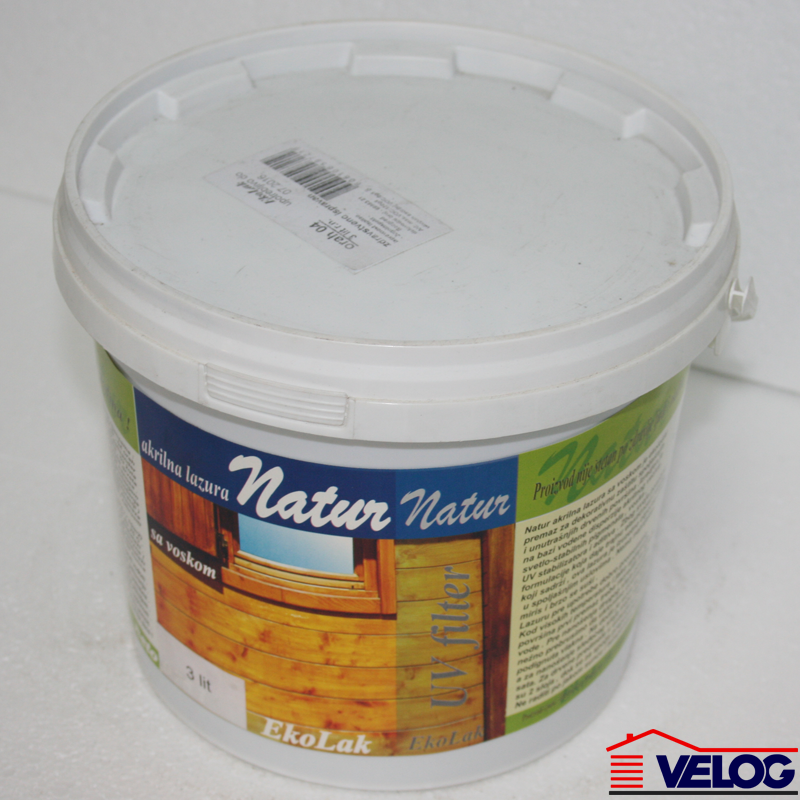 Natur akrilna lazura sa voskom je ekološki premaz za dekorativnu zaštitu spoljašnjih i unutrašnjih drvenih površina.Izrađen je na bazi vodene disperzije akrilnog veziva,svetlo-stabilnih pigmenata, voska, UV stabilizatora i aditiva.Zbog svoje posebne formulacije koja daje trajnu elastičnost i voska koji sadrži, ova lazura je izuzetno otporna i trajna u spoljašnjim uslovima.Nema neprijatan miris i brzo se suši.