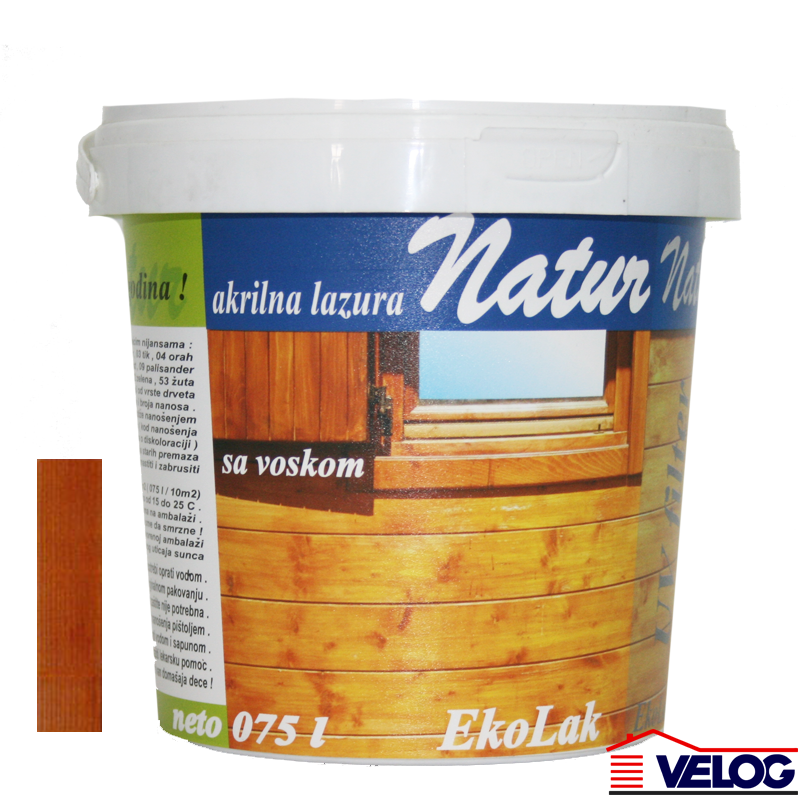 Natur akrilna lazura sa voskom je ekološki premaz za dekorativnu zaštitu spoljašnjih i unutrašnjih drvenih površina.Izrađen je na bazi vodene disperzije akrilnog veziva,svetlo-stabilnih pigmenata, voska, UV stabilizatora i aditiva.Zbog svoje posebne formulacije koja daje trajnu elastičnost i voska koji sadrži, ova lazura je izuzetno otporna i trajna u spoljašnjim uslovima.Nema neprijatan miris i brzo se suši.