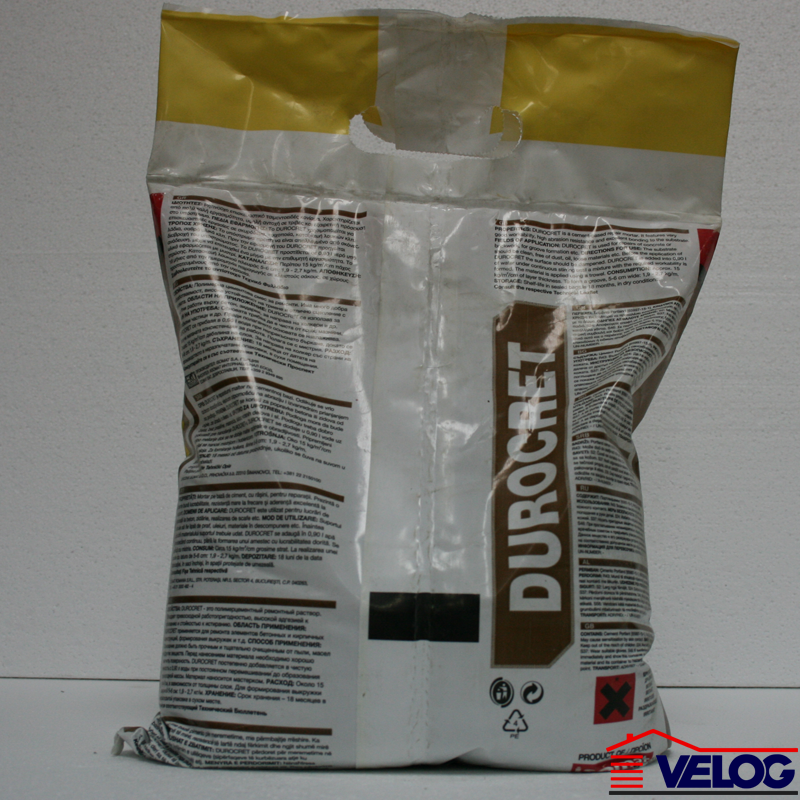 | Primena | DUROCRET se koristi za popravke betona ili zidova od cigle, za izradu holkera, i sl. Verzija u crveno-braon boji je prikladna za radove na krovu sa crepom (seme). DUROCRET se ugrađuje u debljini do 2 cm za veće površine i u debljini do 5 cm za lokalne popravke. |