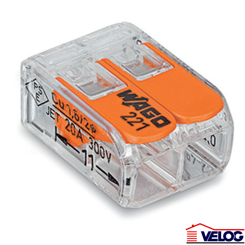 Brza Klema za instalacione kutije Wago 221-412, 2 kontakta za pun presek 4,0kvmm. Broj kontakta: 2; Radni napon: 450V; Jačina radne struje: 32A; Poprečni presek kabla: 0.2 - 4,0mm (12AWG); Dužina neizolovanog dela žice: 11mm.