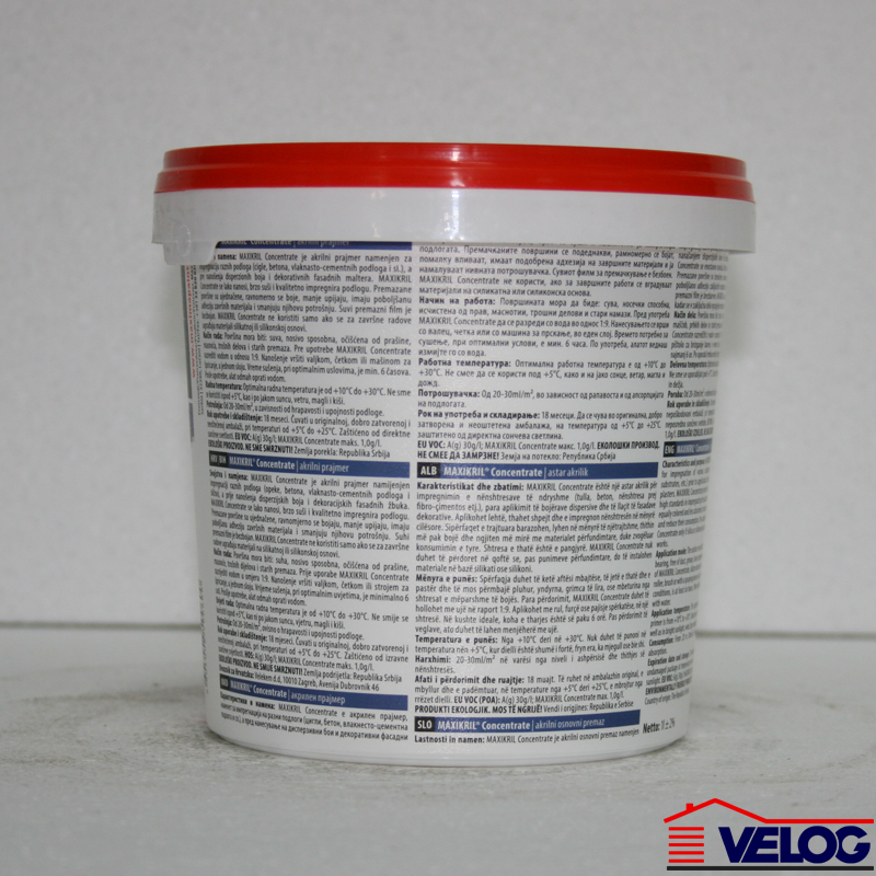 | Primena | Upotrebljava se za impregnaciju raznih podloga (cigle, betona, vlaknasto – cementnih podloga i sl.), a pre nanošenja disperzionih boja i dekorativnih fasadnih maltera. Maxikril koncentrat se lako nanosi, brzo suši i kvalitetno impregnira podlogu. Premazane površine su ujednačene, manje upijaju i poboljšavaju adheziju završnih materijala. Suvi premazani film je bezbojan. Maxikril koncentrat ne koristiti ukoliko se za završne radove primenjuju silikatne, silikonske boje ili silikatni, silikonski dekorativni malteri. |