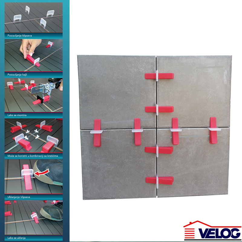 | Dodatne Informacije | Uputstvo za upotrebu klipseva: 1. Naneti lepak i postaviti klipseve ispod pločica 2. Staviti klipseve sa svake strane pločice u zavisnosti od formata iste 3. Postaviti pločice i izravnati Uputstvo za upotrebu kajli stepenastih: 1. Umetnuti kajlu u klips 2. Koristiti klješta za podešavanje visine Uputstvo za uklanjanje klipseva: Kada se lepak osuši potrebno je ukloniti gornji deo klipsa. Gornji deo klipsa se uklanja blagim udarcem nogom ili čekićem u pravcu fuge. |