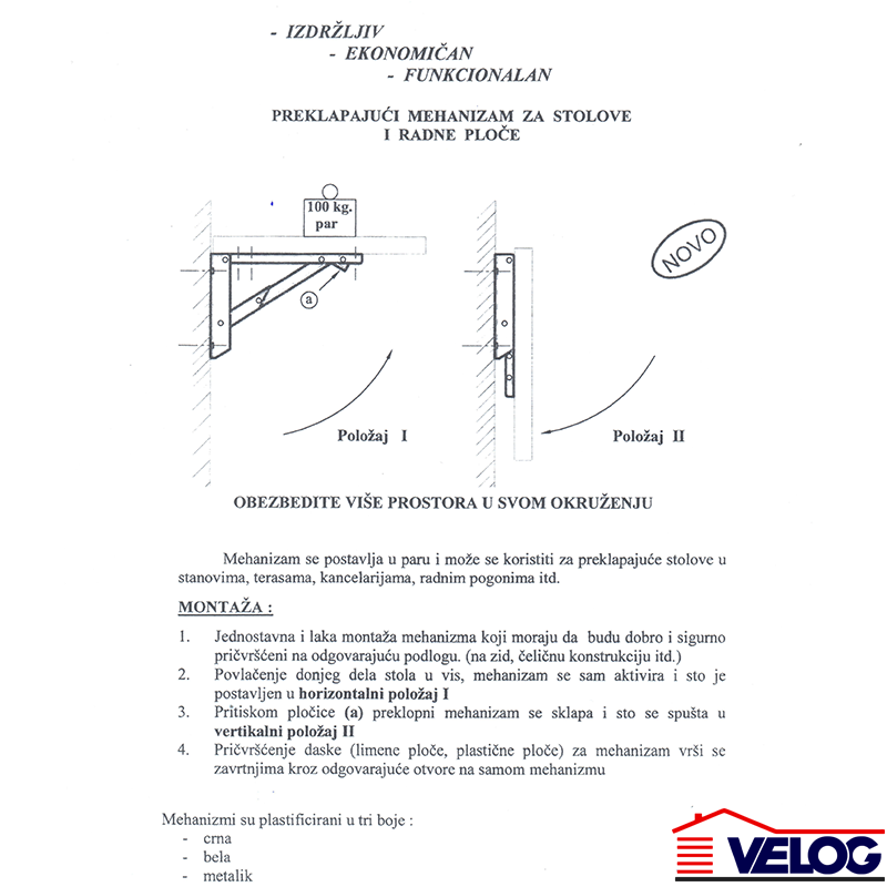 Obezbedite više prostora u vašem okruženju. Mehanizam se postavlja u paru i može se koristiti za preklapajuće stolove u stanovima, terasama, kancelarijama, radnim pogonima itd. Prodaju se u beloj, crnoj i metalik boji. Dimenzije su 33x20cm. Prodaje se na komad.