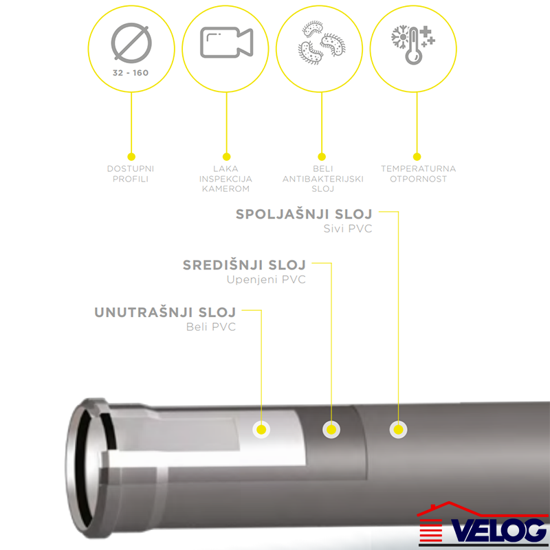 | Primena | Peštan PVC cevi proizvode se kao troslojne cevi sa belim unutrašnjim slojem (antibakterijski sloj), koji zbog posebne tehnologije izrade ima smanjenu hrapavost, što dovodi do smanjenja zadržavanja naslaga na unutrašnjem zidu cevi. Bela boja omogućava lakšu inspekciju cevovoda. Takođe, treba istaći da je posebnom tehnologijom došlo do povećane sposobnosti ovih cevi da smanjuju buku (više nego obična PVC cev), prilikom prolaska fluida kroz njih. |