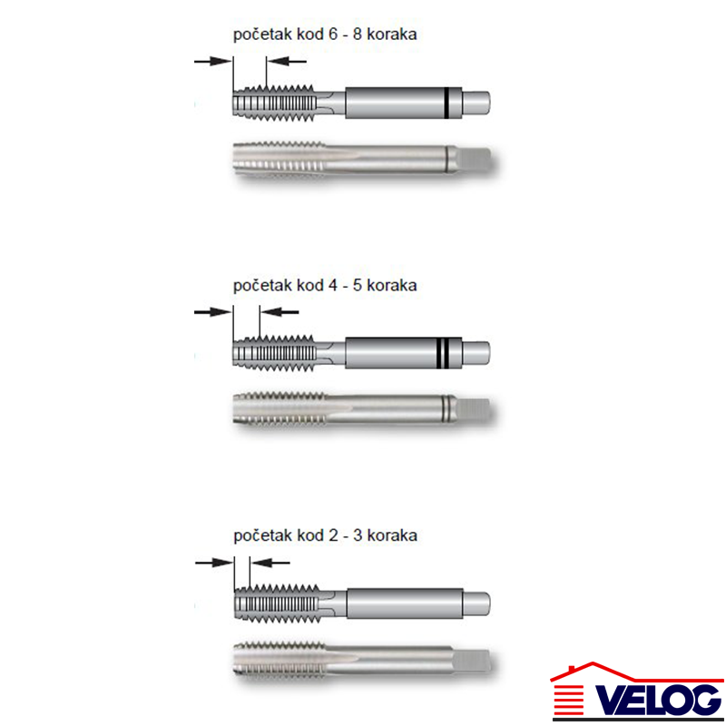 | Primena | Upotrebljavaju se za urezivanje navoja u otvorene i slepe rupe u čelik sa legurama i bez legura zatezne čvrstoće do 800 N/mm2, kovani čelik i nečelične materijale. Trodelna: 1. navojna ureznica: početak kod 5 - 6 koraka 2. navojna ureznica: početak kod 4 - 5 koraka 3. navojna ureznica: početak kod 2 - 3 koraka |