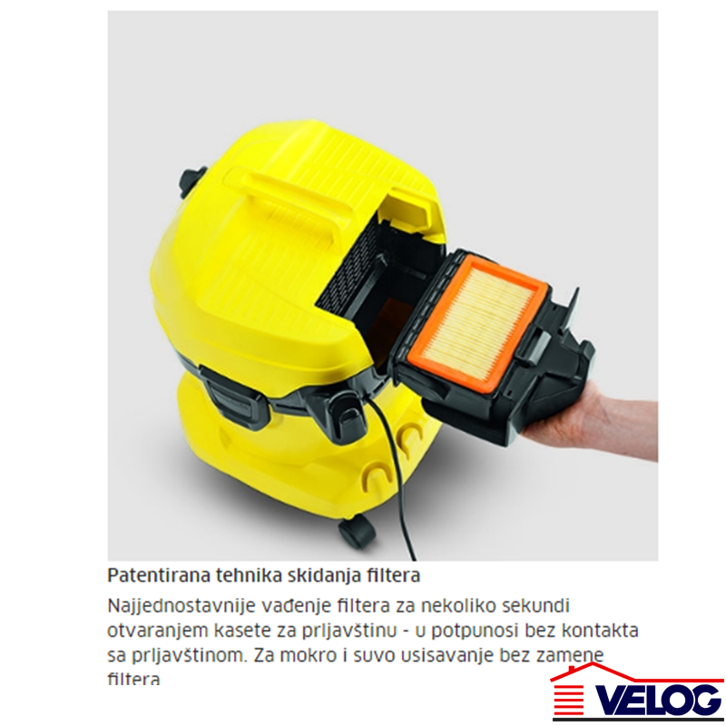 | Primena | Energetska efikasnost susreće visok stepen usisne snage: WD 4 je višenamenski usisivač srednje klase, koji je pri potrošnji struje od 1000 W ubedljiv kao onaj sa usisnom snagom od 1600 W. Usisivač modernog izgleda nudi robustan plastičan rezervoar od 20 l, koji je otporan na udare i ravan faltasti filter u kaseti za filter, koji se zahvaljujući zaokretanju može izvaditi sasvim bez kontakta sa nečistoćom. Filter je namenjen za mokro i suvo usisavanje bez zamene filtera. Novo usisno crevo i nova vrsta stezne mlaznice za pod opremljena sa 2 gumene trake i 2 trake za četku formiraju idealan tim i garantuju stalno sjajne rezultate u čišćenju. Skidiva ručica dozvoljava postavljanje pribora direktno na usisno crevo. U slučaju prekida rada pozicija za odlaganje za usisnu cev i mlaznicu za pod nudi izvanredne usluge. Uz to dolaze "Pull & Push" sistem za zatvaranje, ergonomska drška za nošenje kao i praktično čuvanje kabla i pribora na uređaju. Područja Primene: • Garaža • Servisna radionica • Prostorija za hobi • Podrum • Ulazni sektor • Čišćenje unutrašnjosti automobila • Male količine vode |