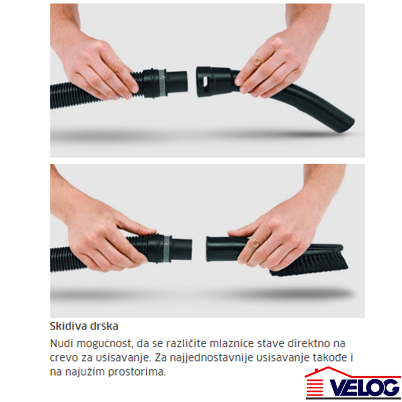 | Obim isporuke | • Usisno crevo 2,2m / 35mm • Usisna cev 2x0,5m / 35mm, plastika • Skidiva drška • Ravan faltasti filter, u kaseti za filter koja se može izvaditi • Filterska vrećica od netkanog tekstila, 1 • Položaj za odlaganje • Čuvanje pribora na uređaju • Zaštita obrtanja otporna na udar • Obrtni prekidač (uklj./isklj.) • Pretinac za odlaganje za male delove |